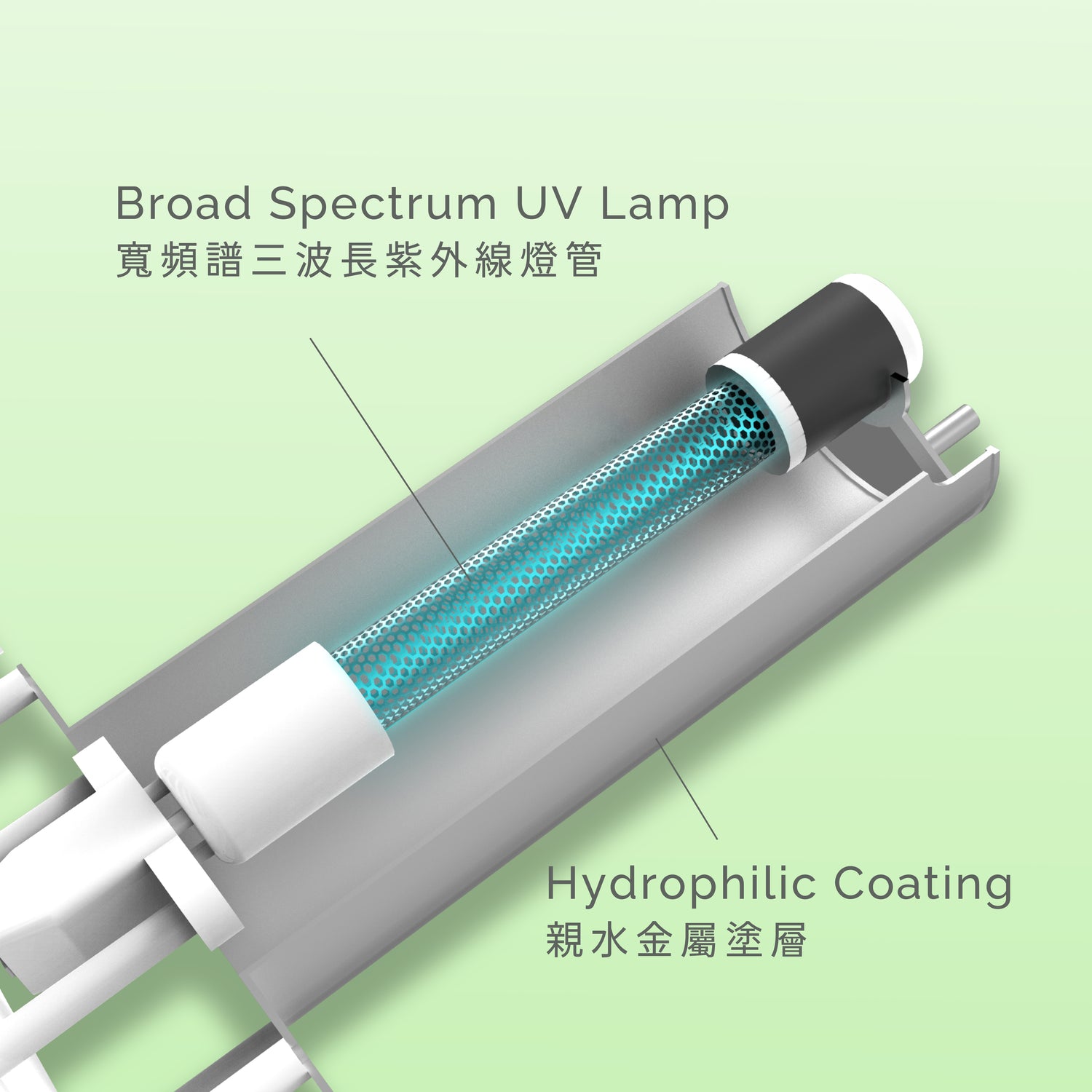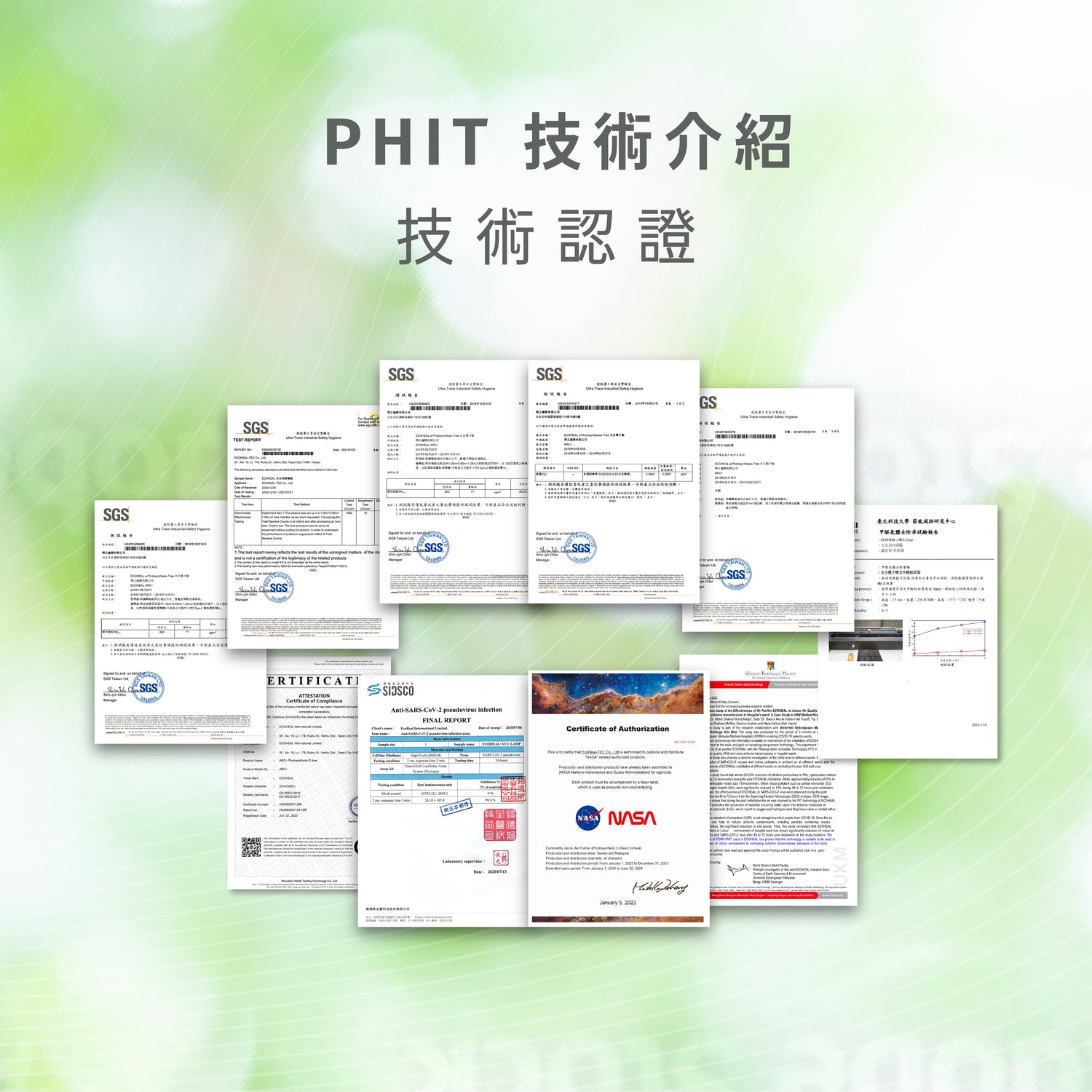 PHIT 專利光解元件會釋放出寬紫光譜,照射於專利腔體表面的奈米光觸媒上,這些觸媒含有親水性金屬,兩者產生催化反應,進而將空氣解離成具有抑菌、除異味及沉降能力的多種淨化因子
