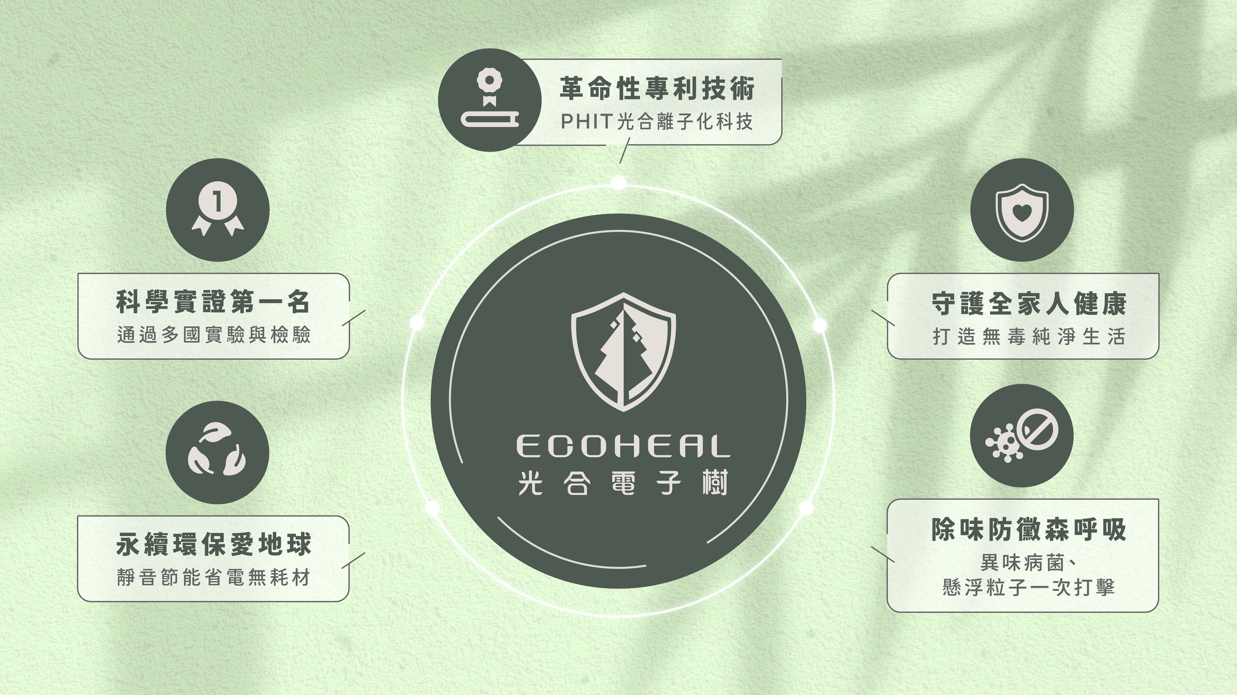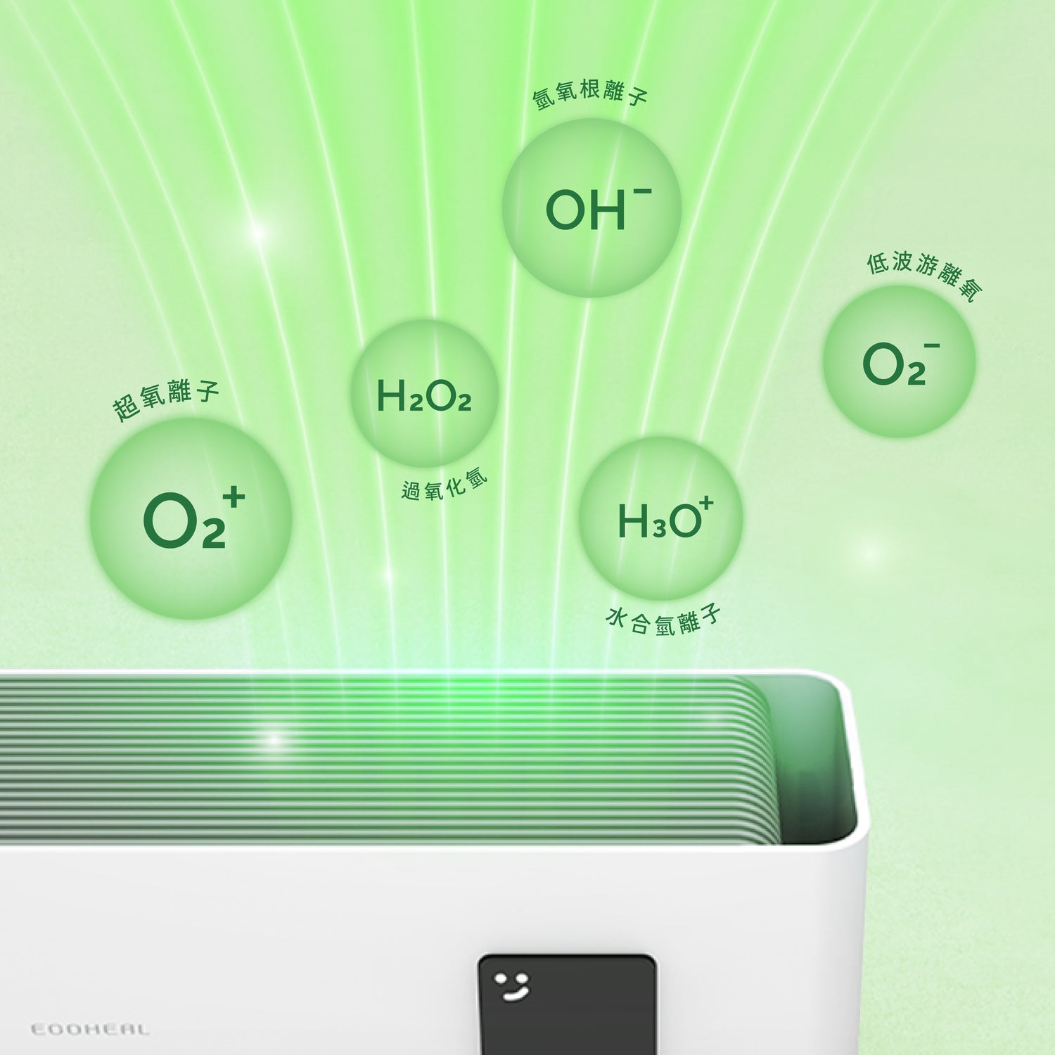 「光合離子技術」將空間中的氧氣,以寬紫光譜分解,再與水氣作用。將每1公升氧轉化為17兆億個高階氧淨化因子。主動清除空氣中飄散的有害物質、細菌病毒及懸浮微粒。最終還原為對人體無害的氧氣、二氧化碳、水及不會被吸入的灰塵。